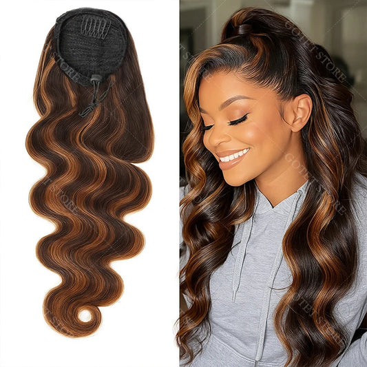 #1B/30 Highlight Body Wave Drawstring Ponytail Human Hair Extensions 30 32 Inch Curly Brazilian Human Hair Extensions For Women
