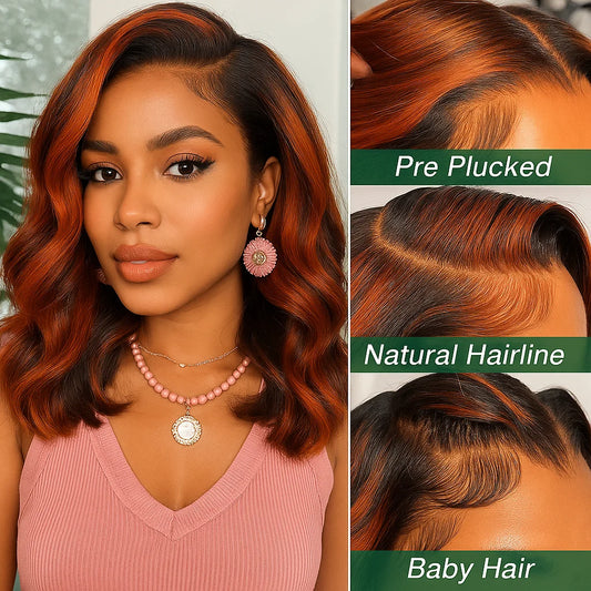 #4/350 Ginger Brown Highlight Short Bob Body Wave Lace Front Wig Human Hair 13x4 Glueless Ombre Balayage Wigs for Black Women